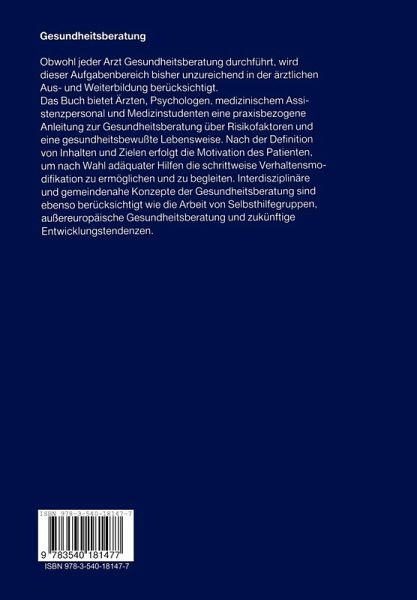 Einführung.- 1 Grundlagen der Gesundheitsberatung - Definitionen, Theorien, Modelle.- Grundlagen der Prävention.- Gesundheitsberatung durch Ärzte.- Rahmenbedingungen der Gesundheitsberatung im Sozialversicherungssystem.- 2 Gesundheitsberatung - Information, Motivation und Handlungsanleitung.- Gesundheitsberatung in der ambulanten Krankenversorgung.- Inhalte und Beispiele ärztlicher Gesundheitsberatung.- Ärztliche Fortbildung zur Methodik präventiver Gesundheitsberatung.- Beratung als Förderung der Motivation zur Verhaltensänderung.- Wie lernen Erwachsene in Beratungssituationen?.- Beratung als Hilfe während der Verhaltensänderung.- Interdisziplinäre Konzepte der Gesundheitsberatung.- 3 Gesundheitsberatung in der ärztlichen Aus-, Weiter- und Fortbildung.- Gesundheitsberatung in der ärztlichen Ausbildung.- Umsetzung von Gesundheitsberatung in der Weiter- und Fortbildung.- Zur Bewertung ärztlicher Gesundheitsberatung.- 4 Gesundheitsberatung - Kooperation, Selbsthilfe und prospektive Konzepte.- Gemeindenahe Prävention - Modelle und Interventionsstrategien am Beispiel einer südhessischen Kleinstadt.- Gesundheitsberatung in Kanada.- Gesundheitliche Selbsthilfegruppen und ihre Zusammenarbeit mit Ärzten.- Gesundheitsberatung durch den Arzt im Jahr 2000.- Autorenkurzbiographien.