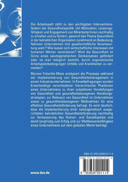 Myriam Fröschle-Mess analysiert die Prozesse während der Implementierung von Gesundheitsmanagement in einem Industrieunternehmen. In Einzelbefragungen wurden Erwerbstätige verschiedener hierarchischer Positionen eines Unternehmens zu ihren subjektiven Vorstellungen von Gesundheit und gesundheitsbezogenen Handlungsstrategien, zur Relevanz von Gesundheit im Unternehmen sowie zu gesundheitsbezogenen Maßnahmen für eine effektive Gesundheitsförderung befragt. Es wird deutlich, dass die Implementierung einer salutogenetisch ausgerichteten betrieblichen Gesundheitsförderung nachhaltig zur Verbesserung des Human- und Sozialkapitals und damit langfristig zum Erfolg und zur Wettbewerbsfähigkeit eines Unternehmens auf dem globalen Markt beiträgt.