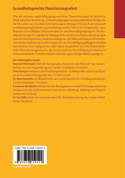 Emanuel Beerheide leitet die Fachgruppe "Analysen und Projekte" am Landesinstitut für Arbeitsgestaltung des Landes Nordrhein-Westfalen. Arno Georg koordiniert den Forschungsbereich "Arbeitspolitik und Gesundheit" an der Sozialforschungsstelle der TU Dortmund. Dr. Anne Goedicke ist Mitarbeiterin am Landesinstitut für Arbeitsgestaltung des Landes Nordrhein-Westfalen. Constanze Nordbrock arbeitet bei der Berufsgenossenschaft Nahrungsmittel und Gastgewerbe als stellvertretende Leiterin der Abteilung "Bildung und Organisationsentwicklung". Dr. Kai Seiler leitet das Landesinstitut für Arbeitsgestaltung des Landes Nordrhein-Westfalen.