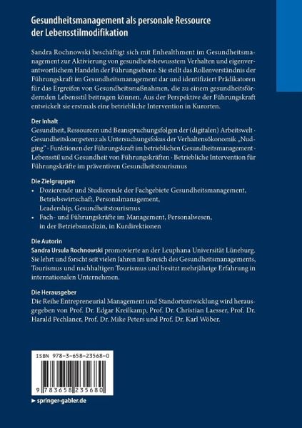 Sandra Rochnowski beschäftigt sich mit Enhealthment im Gesundheitsmanagement zur Aktivierung von gesundheitsbewusstem Verhalten und eigenverantwortlichem Handeln der Führungsebene. Sie stellt das Rollenverständnis der Führungskraft im Gesundheitsmanagement dar und identifiziert Prädikatoren für das Ergreifen von Gesundheitsmaßnahmen, die zu einem gesundheitsfördernden Lebensstil beitragen können. Aus der Perspektive der Führungskraft entwickelt sie erstmals eine betriebliche Intervention in Kurorten.