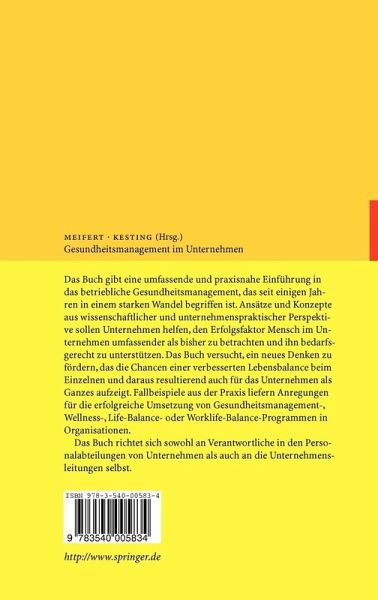 Das Buch gibt eine umfassende und praxisnahe Einführung in das betriebliche Gesundheitsmanagement, das seit einigen Jahren in einem starken Wandel begriffen ist. Ansätze und Konzepte aus wissenschaftlicher und unternehmenspraktischer Perspektive sollen Unternehmen helfen, den Erfolgsfaktor Mensch im Unternehmen umfassender als bisher zu betrachten und ihn bedarfsgerecht zu unterstützen. Das Buch versucht, ein neues Denken zu fördern, das die Chancen einer verbesserten Lebensbalance beim Einzelnen und daraus resultierend auch für das Unternehmen als Ganzes aufzeigt. Fallbeispiele aus der Praxis liefern Anregungen für die erfolgreiche Umsetzung von Gesundheitsmanagement-, Wellness-, Life-Balance- oder Worklife-Balance-Programmen in Organisationen.Das Buch richtet sich sowohl an Verantwortliche in den Personalabteilungen von Unternehmen als auch an die Unternehmensleitungen selbst.