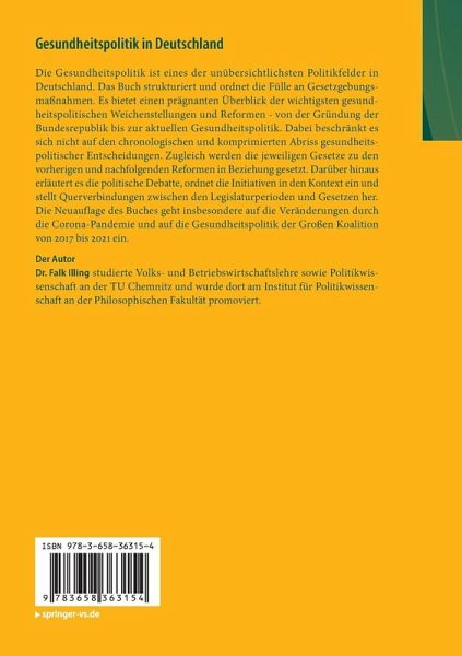 Die Gesundheitspolitik ist eines der unübersichtlichsten Politikfelder in Deutschland. Das Buch strukturiert und ordnet die Fülle an Gesetzgebungsmaßnahmen. Es bietet einen prägnanten Überblick der wichtigsten gesundheitspolitischen Weichenstellungen und Reformen - von der Gründung der Bundesrepublik bis zur aktuellen Gesundheitspolitik. Dabei beschränkt es sich nicht auf den chronologischen und komprimierten Abriss gesundheitspolitischer Entscheidungen. Zugleich werden die jeweiligen Gesetze zu den vorherigen und nachfolgenden Reformen in Beziehung gesetzt. Darüber hinaus erläutert es die politische Debatte, ordnet die Initiativen in den Kontext ein und stellt Querverbindungen zwischen den Legislaturperioden und Gesetzen her. Die Neuauflage des Buches geht insbesondere auf die Veränderungen durch die Corona-Pandemie und auf die Gesundheitspolitik der Großen Koalition von 2017 bis 2021 ein.