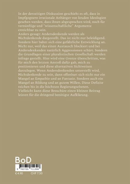 In der derzeitigen Diskussion geschieht es oft, dass in Impfgegnern irrationale Anhänger von kruden Ideologien gesehen werden, dass ihnen abgesprochen wird, noch für vernünftige und "wissenschaftliche" Argumente erreichbar zu sein.Anders gesagt: Andersdenkende werden als Nichtdenkende dargestellt. Das ist nicht nur beleidigend. Sondern hier bahnt sich eine gefährliche Entwicklung an. Nicht nur, weil das einen Austausch blockiert und bei Andersdenkenden natürlich Aggressionen schürt. Sondern die Grundlagen einer pluralistischen Gesellschaft werden infrage gestellt. Hier wird eine Grenze überschritten, was für mich den letzten Anstoß dafür gab, mich zu positionieren und diese alternativen Sichtweisen darzulegen. Wenn Andersdenkenden unterstellt wird, Nichtdenkende zu sein, dann offenbart sich nicht nur ein Mangel an Empathie und an Fantasie. Sondern auch ein Mangel an Bildung und an gutem Willen. Diese Defizite reichen bis in die höchsten Regierungsebenen.Vielleicht kann diese Broschüre einen kleinen Beitrag leisten für die dringend benötigte Aufklärung.