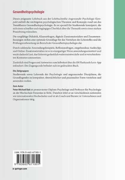 Dieses prägnante Lehrbuch aus der Lehrbuchreihe Angewandte Psychologie Kompakt enthält die wichtigsten psychologischen Theorien und Konzepte rund um das Trendthema Gesundheitspsychologie. Es ist speziell für Studierende konzipiert, die sich einen schnellen und eingängigen Überblick über die Thematik sowie einen starken Praxisbezug wünschen. Die sorgfältige Didaktik, Klausurfragen, digitale Zusatzmaterialien und Zusammenfassungen stellen eine optimale Grundlage für das Verstehen des Lehrstoffes und die Prüfungsvorbereitung im Bereich der Gesundheitspsychologie dar. Durch zahlreiche Anwendungsbeispiele, Reflexionsfragen, eingebundene Audioclips und Online-Zusatzmaterialien ist es in einzigartiger Weise anwendungsorientiert und weckt dadurch Lust, das Gelernte gedanklich weiterzuentwickeln und in verschiedensten Kontexten umzusetzen. Zusätzlich sind Fragen und Antworten zum Selbsttest über die SN Flashcards Lern-App inkludiert. Der Zugangscode befindet sich im gedruckten Buch.