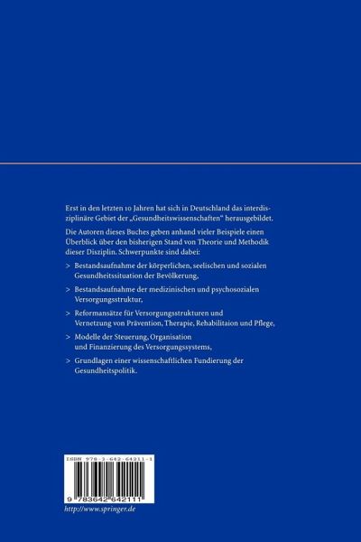 Die Arbeitsschwerpunkte der Gesundheitswissenschaften. Entstehung, Entwicklung und Aufgaben der Gesundheitswissenschaften. Medizinisch epidemiologische Arbeitsweisen der Gesundheitswissenschaften. Sozialwissenschaftliche Analyse von Gesundheitsproblemen. Wirtschaftswissenschaftliche Analyse des Gesundheitssystems. Serviceteil. Autorenprofile. Stichwortverzeichnis.