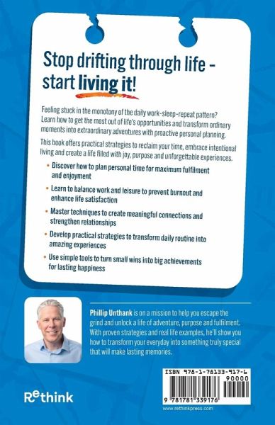 Stop drifting through life - start living it! Feeling stuck in the monotony of the daily work-sleep-repeat pattern? Learn how to get the most out of life's opportunities and transform ordinary moments into extraordinary adventures with proactive personal planning. This book offers practical strategies to reclaim your time, embrace intentional living and create a life filled with joy, purpose and unforgettable experiences. Discover how to plan personal time for maximum fulfilment and enjoyment Learn to balance work and leisure to prevent burnout and enhance life satisfaction Master techniques to create meaningful connections and strengthen relationships Develop practical strategies to transform daily routine into amazing experiences Use simple tools to turn small wins into big achievements for lasting happiness