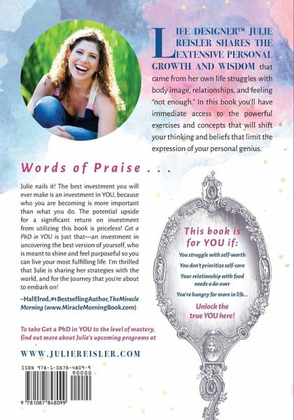 In Get a PhD in YOU: A Course in Miraculous Self-Discovery, you will begin to excavate a more extraordinary version of YOU! "Julie nails it! The best investment you will ever make is an investment in YOU, because who you are becoming is more important that what you do. The potential upside for a significant return on investment from utilizing this book is priceless! Get a PhD in YOU is just that - an investment in uncovering the best version of yourself, who is meant to shine and feel purposeful so you can live your most fulfilling life. I'm thrilled that Julie is sharing her strategies with the world and for the journey that you're about to embark on!" -- HAL ELROD, #1 bestselling author, The Miracle Morning. What if you learned to master your inner world so that you could master your outer world - and experience a life that is extraordinary? What if you could see what's blocking your potential and truly get unstuck? What if you could turn your life from fine to unstoppable? How would life be different? More joy? More happiness? Better relationships? More prosperity? Healthier? Less Stress? More inner peace? This book is for YOU if: *You struggle with self-worth*You don't prioritize self-care*Your relationship with food needs a do-over*You're hungry for more in life...Unlock the true YOU here!I am here to tell you that everything you want for your life is possible - the transformation you are seeking - is already within you. Ready to dive in and create a life you love? Humanity is waiting for YOUR sacred self. THE MOST PRICELESS INVESTMENT IS THE INVESTMENT IN YOU. IT'S TIME TO UNCOVER YOUR FULL POTENTIAL. SAY YES TO YOUR BEST LIFE! What's inside:* 3 Powerful Practices to Defeat Limiting Beliefs * 12 Breakthrough Sessions to Reach Your Next Level * 65 Investing in YOU Activities to Help You Take Care of YOU! * Destiny Uncovering Journal Prompts * Right Brain Mastery Coloring Pages * Bonus Self-Nurturing Section As you take this miraculous journey in self-discovery you will uncover and awaken the powerful creator that is already within you. Get your copy now and say "Yes" to letting the world see who you are.