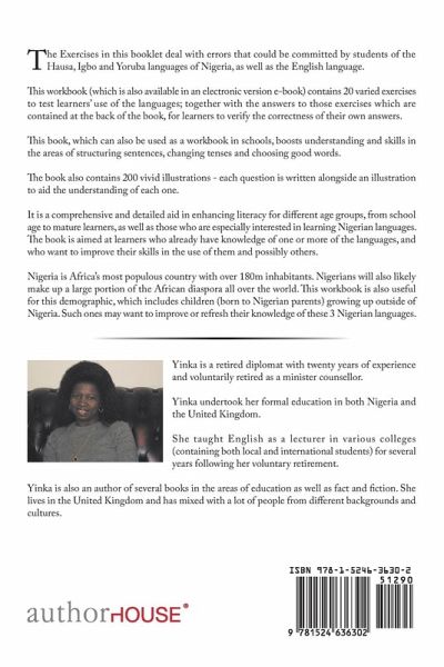 The Exercises in this booklet deal with errors that could be committed by students of the Hausa, Igbo and Yoruba languages of Nigeria, as well as the English language. This workbook (which is also available in an electronic version e-book) contains 20 varied exercises to test learners' use of the languages; together with the answers to those exercises which are contained at the back of the book, for learners to verify the correctness of their own answers. This book, which can also be used as a workbook in schools, boosts understanding and skills in the areas of structuring sentences, changing tenses and choosing good words. The book also contains 200 vivid illustrations - each question is written alongside an illustration to aid the understanding of each one. It is a comprehensive and detailed aid in enhancing literacy for different age groups, from school age to mature learners, as well as those who are especially interested in learning Nigerian languages. The book is aimed at learners who already have knowledge of one or more of the languages, and who want to improve their skills in the use of them and possibly others. Nigeria is Africa's most populous country with over 180m inhabitants. Nigerians will also likely make up a large portion of the African diaspora all over the world. This workbook is also useful for this demographic, which includes children (born to Nigerian parents) growing up outside of Nigeria. Such ones may want to improve or refresh their knowledge of these 3 Nigerian languages.