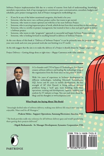 Software Projects implementation fails due to a variety of reasons: from lack of understanding, knowledge, unrealistic expectations, lack of top management commitment, poor communication, unrealistic budgets and schedules, poor project management, lack of Project management methodology etc. If you fit in any of the below mentioned categories, this book is for you: Someone, who has never run a software project earlier, but wants to get started. Someone, who wants to ensure optimal cost with his or her next Software Project. Someone, who is carrying important piece of work, which deviate from their normal day-to-day workings. Someone, who is a newbie to project management, but wanted to have a clear and quick guide to deliver a Software project. Someone, who wants to take "pragmatic" approach to successful and happy Software Project delivery. Someone, who is looking forward to excelling himself in delivery of Software Projects. As the core theme of this book is "Delivery of Software Projects" it can be primarily used for projects within your own work and even your personal work also not limiting it to IT world. As the title suggest that the aim is to make the delivery of a Project it should always be "happy" experience". Project Delivery = Getting things done at right time = Happy Customers with value addition