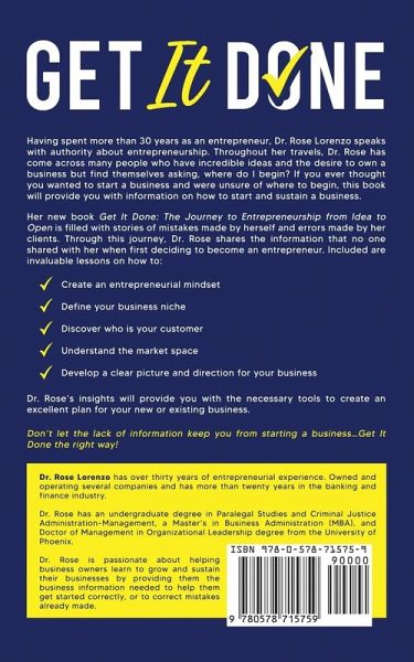 Having spent more than 30 years as an entrepreneur, Dr. Rose Lorenzo speaks with authority about entrepreneurship. Throughout her travels, Dr. Rose has come across many people who have incredible ideas and the desire to own a business but find themselves asking, where do I begin? If you ever thought you wanted to start a business and were unsure of where to begin, this book will provide you with information on how to start and sustain a business. Her new book Get It Done: The Journey to Entrepreneurship from Idea to Open is filled with stories of mistakes made by herself and errors made by her clients. Through this journey, Dr. Rose shares the information that no one shared with her when first deciding to become an entrepreneur. Included are invaluable lessons on how to: · Create an entrepreneurial mindset · Define your business niche · Discover who is your customer · Understand the market space · Develop a clear picture and direction for your business Dr. Rose's insights will provide you with the necessary tools to create an excellent plan for your new or existing business. Don't let the lack of information keep you from starting a business...Get It Done the right way!