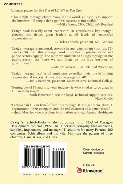 Advance praise for Get Out of I.T. While You Can. "This simple message eludes many in this world. Our job is to support the business-if people don't get this, success is impossible." -Mike Jones, CIO, Children's Hospital "Craig's book is really about leadership. He articulates a key thought process that drives great leaders at all levels of successful organizations." -Dirk Debbink, president, MSI General "Craig's message is universal. Anyone in any department (not just IT) can benefit from this message. And it applies to private sector and public sectors equally. The more we understand Craig's message in the public sector, the more we can focus on the true business of government." -Matt Miszewski, CIO, State of Wisconsin "Craig's message inspires all employees to realize their role in driving organizational success. A must-hear message for all!" -Betty Barhorst, president, Madison Area Technical College "Getting out of IT and into your industry is what it takes to be great in IT. Great message!" -Mark Henderson, section head, technical support services, Mayo Clinic "Everyone in IT can benefit from this message. It will get them, their IT organization, their company, and the real customer to a better place." -Judy Murphy, vice president information services, Aurora Healthcare