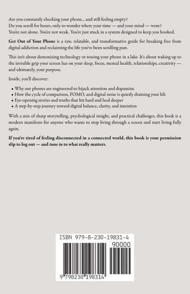 Are you constantly checking your phone... and still feeling empty? Do you scroll for hours, only to wonder where your time - and your mind - went? You're not alone. You're not weak. You're just stuck in a system designed to keep you hooked. Get Out of Your Phone is a raw, relatable, and transformative guide for breaking free from digital addiction and reclaiming the life you've been scrolling past. This isn't about demonizing technology or tossing your phone in a lake. It's about waking up to the invisible grip your screen has on your sleep, focus, mental health, relationships, creativity - and ultimately, your purpose. Inside, you'll discover:Why our phones are engineered to hijack attention and dopamine How the cycle of comparison, FOMO, and digital noise is quietly draining your life Eye-opening stories and truths that hit hard and heal deeper A step-by-step journey toward digital balance, clarity, and intention With a mix of sharp storytelling, psychological insight, and practical challenges, this book is a modern manifesto for anyone who wants to stop living through a screen and start living fully again. If you're tired of feeling disconnected in a connected world, this book is your permission slip to log out - and tune in to what really matters.