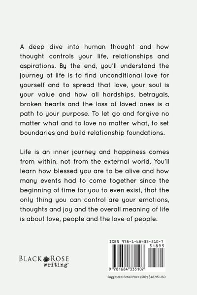 A deep dive into human thought and how thought controls your life, relationships and aspirations. By the end, you'll understand the journey of life is to find unconditional love for yourself and to spread that love, your soul is your value and how all hardships, betrayals, broken hearts and the loss of loved ones is a path to your purpose. To let go and forgive no matter what and to love no matter what, to set boundaries and build relationship foundations. Life is an inner journey and happiness comes from within, not from the external world. You'll learn how blessed you are to be alive and how many events had to come together since the beginning of time for you to even exist, that the only thing you can control are your emotions, thoughts and joy and the overall meaning of life is about love, people and the love of people.