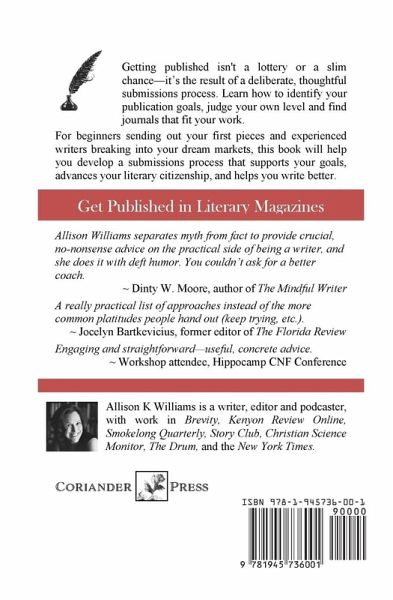 Getting published isn't a lottery or a slim chance-it's the result of a thoughtful, deliberate submissions process. Learn how to identify your publication goals, judge your own level and find journals that are the right fit for your work. For beginners sending out your first finished pieces and experienced writers breaking into your dream markets, this book will help you develop a submissions process that supports your goals, advances your literary citizenship, and helps you write better. A really practical list of approaches instead of the more common platitudes people hand out (keep trying, etc.). ~ Jocelyn Bartkevicius, former editor of The Florida Review Allison Williams separates myth from fact to provide crucial, no-nonsense advice on the practical side of being a writer, and she does it with deft humor. You couldn't ask for a better coach. ~ Dinty W. Moore, author of The Mindful Writer Engaging and straightforward-useful, concrete advice. ~ Workshop attendee, Hippocamp Creative Nonfiction Conference