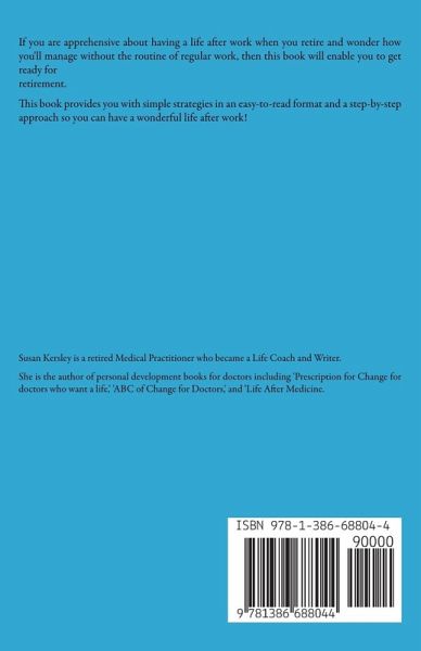 Are you apprehensive about having a life after work? Do you wonder how you'll manage without the routine of work? This book will enable you to get ready for retirement. This book provides you with simple strategies in an easy-to-read format and a step-by-step approach so you can enjoy life after work and make the changes you want to make. Susan Kersley is a retired Medical Practitioner who became a Life Coach and Writer. She is the author of personal development books for doctors including 'Prescription for Change for doctors who want a life,' 'ABC of Change for Doctors,' and 'Life After Medicine. She has also published novels: 'Pills and Pillboxes' and 'Connection Deception.'