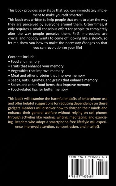 This book provides easy steps that you can immediately implement to make yourself smarter! This book was written to help people that want to alter the way they are perceived by everyone around them. Often times, it only requires a small conscious effort for people to completely alter the way people perceive them. First impressions are crucial and nobody wants to come off looking like a slouch, so let me show you how to make the necessary changes so that you can revolutionize your life! Contents include:Food and memory Fruits that enhance your memory Vegetables that improve memory Meat and other proteins that improve memory Seeds, nuts, legumes, and grains that enhance memory Spices and other food items that improve memory Food-related tips for better memory This book will examine the harmful impacts of smartphone use and offer helpful suggestions for reducing dependency on these gadgets. Readers will discover how to sharpen their minds and enhance their general welfare without relying on cell phones through activities like reading, writing, meditating, and exercising. Readers who adopt a smartphone-free lifestyle will experience improved attention, concentration, and intellect.