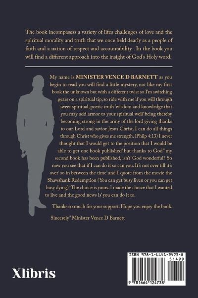 The book incompasess a variety of lifes challenges of love and the spiritual morality and truth that we once held dearly as a people of faith and a nation of respect and accountability . In the book you will find a different approach into the insight of God's Holy word.