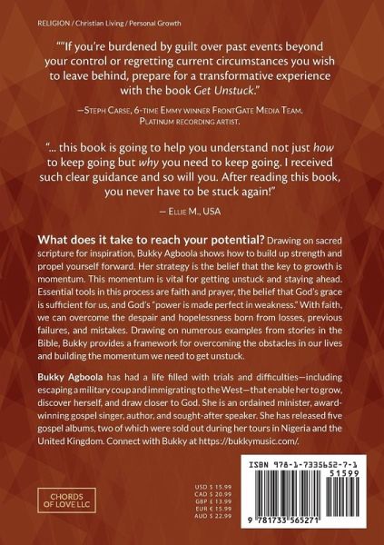 What does it take to reach your potential? Drawing on sacred scripture for inspiration, Bukky Agboola shows how to build up strength and propel yourself forward. Her strategy is the belief that the key to growth is momentum. This momentum is vital for getting unstuck and staying ahead. Essential tools in this process are faith and prayer, the belief that God's grace is sufficient for us, and God's "power is made perfect in weakness." With faith, we can overcome the despair and hopelessness born from losses, previous failures, and mistakes. Drawing on numerous examples from stories in the Bible, Bukky provides a framework for overcoming the obstacles in our lives and building the momentum we need to get unstuck.