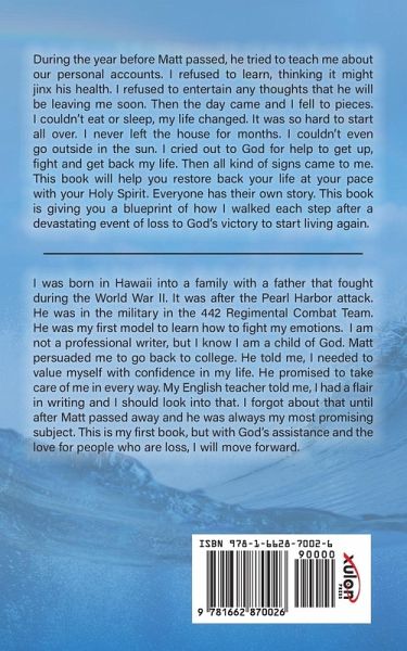 During the year before Matt passed, he tried to teach me about our personal accounts. I refused to learn, thinking it might jinx his health. I refused to entertain any thoughts that he will be leaving me soon. Then the day came and I fell to pieces. I couldn't eat or sleep, my life changed. It was so hard to start all over. I never left the house for months. I couldn't even go outside in the sun. I cried out to God for help to get up, fight and get back my life. Then all kind of signs came to me. This book will help you restore back your life at your pace with your Holy Spirit. Everyone has their own story. This book is giving you a blueprint of how I walked each step after a devastating event of loss to God's victory to start living again. I was born in Hawaii into a family with a father that fought during the World War II. It was after the Pearl Harbor attack. He was in the military in the 442 Regimental Combat Team. He was my first model to learn how to fight my emotions. I am not a professional writer, but I know I am a child of God. Matt persuaded me to go back to college. He told me, I needed to value myself with confidence in my life. He promised to take care of me in every way. My English teacher told me, I had a flair in writing and I should look into that. I forgot about that until after Matt passed away and he was always my most promising subject. This is my first book, but with God's assistance and the love for people who are loss, I will move forward.