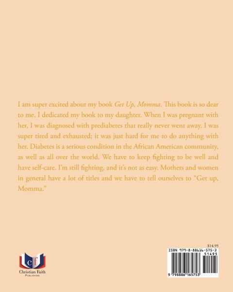 I am super excited about my book Get Up, Momma. This book is so dear to me. I dedicated my book to my daughter. When I was pregnant with her, I was diagnosed with prediabetes that really never went away. I was super tired and exhausted; it was just hard for me to do anything with her. Diabetes is a serious condition in the African American community, as well as all over the world. We have to keep fighting to be well and do self-care. I'm still fighting, and it's not as easy. Mothers and women in general have a lot of titles and we have to tell ourselves to "Get up, Momma."
