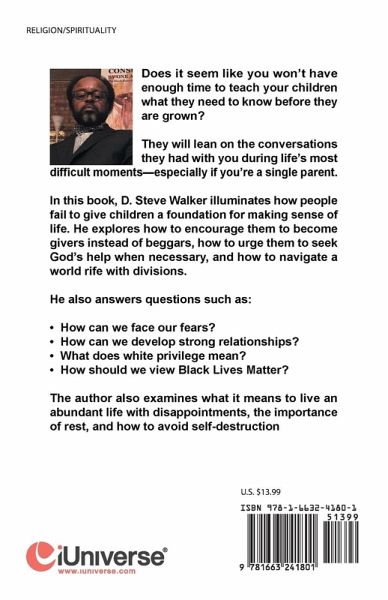 Does it seem like you won't have enough time to teach your children what they need to know before they are grown? They will lean on the conversations they had with you during life's most difficult moments-especially if you're a single parent. In this book, D. Steve Walker illuminates how people fail to give children a foundation for making sense of life. He explores how to encourage them to become givers instead of beggars, how to urge them to seek God's help when necessary, and how to navigate a world rife with divisions. He also answers questions such as: ¿ How can we face our fears? ¿ How can we develop strong relationships? ¿ What does white privilege mean? ¿ How should we view Black Lives Matter? The author also examines what it means to live an abundant life with disappointments, the importance of rest, and how to avoid self-destruction