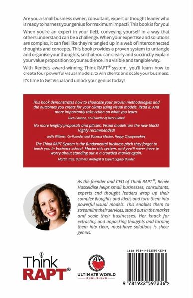 Are you a small business owner, consultant, expert or thought leader who is ready to harness your genius for maximum impact? This book is for you! When you're an expert in your field, conveying yourself in a way that others understand can be a challenge. When your expertise and solutions are complex, it can feel like they're tangled up in a web of interconnected thoughts and concepts. This book provides a proven system to untangle and organise your thoughts, so that you can clearly and succinctly explain your value proposition to your audience, in a visible and tangible way. With Renée's award-winning Think RAPT(TM) system, you'll learn how to create four powerful visual models, to win clients and scale your business. It's time to Get Visual and unlock your genius today! This book demonstrates how to showcase your proven methodologies and the outcomes you create for your clients using visual models. Read it. And more importantly take action on what you learn. Glen Carlson Co-Founder of Dent Global No more lengthy proposals and pitches. Visual models are the new black! Highly recommended! Jodie Willmer Co-Founder and Business Mentor, Happy Changemakers The Think RAPT System is the fundamental business pitch they forgot to teach you in business school. Master this system, and you'll never have to worry about standing out in a crowded market again. Martin Traz Business Strategist & Expert Legacy Builder As the founder and CEO of Think RAPT(TM), Renée Hasseldine helps small businesses, consultants, experts and thought leaders wrap up their complex thoughts and ideas and turn them into powerful visual models. This enables them to streamline their services, stand out in the market and scale their businesses. Her knack for extracting and unpacking thoughts and turning them into clear, must-have solutions is sheer genius.