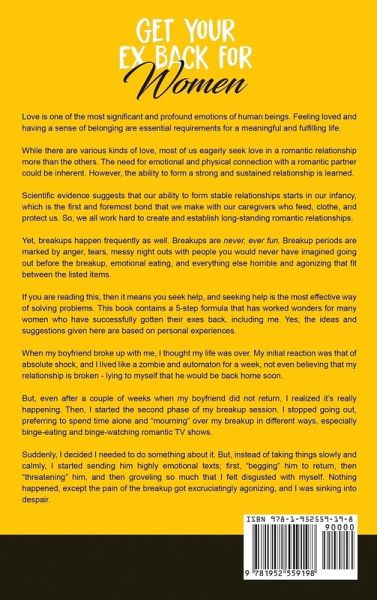 If you have always wanted to find foolproof ways to get over the pain of a breakup, understand the causes of it, and what it takes to get your ex back, then keep reading. Breakups are heartbreaking, and the struggle of overcoming it can challenge the strongest of women.Have you also struggled with this issue? Are you sick and tired of having to deal with negative emotions after a breakup? Have you tried umpteen solutions and not found anything that lasts for more than a couple of weeks? Have you reached your rope's end and want to end all your suffering by identifying the most practical and amazing ideas to overcome the pain of a breakup? If yes, then you have come to the perfect place. This book is packed with amazing, thought-provoking ideas to help you with your struggle with breakups - the first thing to know is that overcoming a breakup is easier than you think. Yes, the journey may appear steep and arduous. However, with the right kind of support, you can get through the tough phase easily and emerge stronger than ever before. This book contains:Over 20 thought-provoking ideas on how to get the right perspective on the breakup including what, how, and why things went wrong. Five excellent ideas that will make you ponder on whether and why you should work on getting your ex back. Numerous stunning thoughts on understanding men and their needs. Ground-breaking ideas on whether to forgive cheating. Five powerful and effective steps that will help you get your ex back. More than 50 different ideas on how to keep your ex for good and to build a strong, sustainable relationship that will be the envy of all. Before you begin, just imagine yourself happily back with your ex leading a meaningful and purpose-filled life. Use this image to harness your inner strength and willpower and read on to discover remarkable secrets to getting your ex back. Scroll up and click the "add to cart" button now to learn more!