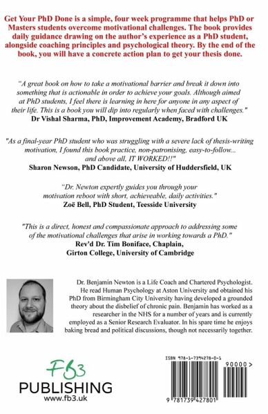Get Your PhD Done is a simple, four week programme that helps PhD or Masters students overcome motivational challenges. The book provides daily guidance drawing on the author's experience as a PhD student, alongside coaching principles and psychological theory. By the end of the book, you will have a concrete action plan to get your thesis done. Praise for Get Your PhD Done "Dr. Newton expertly guides you through your motivation reboot with short, achievable, daily activities." Zoë Bell, PhD Student, Teeside University "As a final-year PhD student who was struggling with a severe lack of thesis-writing motivation, I found this book practice, non-patronising, easy-to-follow...and above all, IT WORKED!!" Sharon Newson, PhD Candidate, University of Huddersfield, UK "A great book on how to take a motivational barrier and break it down into something that is actionable in order to achieve your goals. Although aimed at PhD students, I feel there is learning in here for anyone in any aspect of their life. This is a book you will dip into regularly when faced with challenges." Dr Vishal Sharma, PhD, Improvement Academy, Bradford, UK About the Author Dr. Benjamin Newton is a Chartered Psychologist and Life Coach. He undertook his undergraduate degree in Human Psychology and received a 1st Class Honours degree. His PhD involved developing a theory about why people with chronic pain experience disbelief. He has worked as a mental health researcher, charity worker and is currently a Senior Research Evaluator. When Benjamin isn't working he enjoys faith and political discussions and bread making (but not necessarily together). Want to understand a bit more about the book contents? In Section 1, we look at your motivation for finishing your PhD. In Section 2, we explore your motivational difficulties. In Section 3, we clarify your specific motivational difficulties. Finally, in Section 4, we facilitate the development of an action plan. You may also be interested in other editions of the book. Alongside the e-book, there is a paperback version. To support students who find reading more challenging, we have created a larger print version printed in OpenDyslexic font.