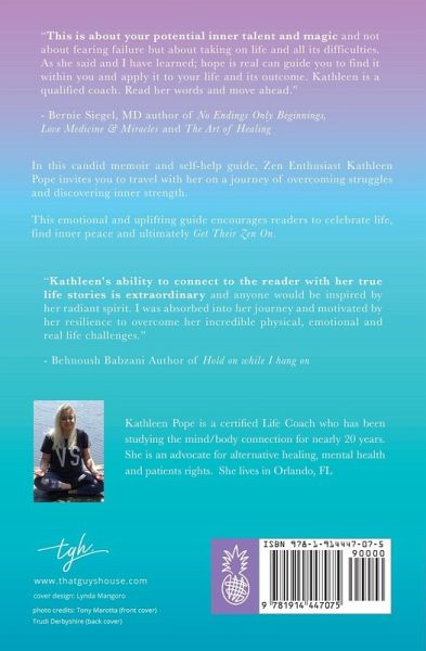 Welcome to Get Your Zen On! In this book, Zen Enthusiast Kathleen Pope invites you to travel with her on a journey of overcoming struggles, discovering inner strength, and ultimately finding Zen. Kathleen never seemed to have it easy. When she was only five months old, she had her first heart surgery and seemed to be in and out of the hospital throughout her entire childhood. However, through the support of her mother, she learned not to let anything break her spirit or hold her back, in fact, her setbacks only encouraged her to live life more fully and she was sure that she was promised a beautiful future ahead. With courage and tenacity, at the age of twenty-two, she left her hometown in New Jersey and moved to Orlando, Florida to pursue a career at a world-famous theme park. Though she soon began to see her dream coming true, Kathleen still faced many challenges that cultivated her ability to find Zen no matter what. The principles of God, Love and Faith that had been instilled in her by her mother guided her to find the strength and hope she needed. In the candid memoir and self-help guide, Kathleen shares her methods on how she got her Zen on during struggles, triumphs and everything in between. This thought-provoking, emotional, inspirational, and uplifting book encourages readers to find their own Zen and celebrate this gift of Life!