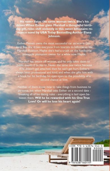 He never dates the same woman twice. She's his driver. When Esther gives Marshall a thoughtful birthday gift, roles shift violently in this sweet billionaire romance novel by USA Today Bestselling Author Elana Johnson. Esther Pinnett owns the most successful car service in Getaway Bay. She drives everyone from tourists to billionaires like Marshall Robison. Maybe she's had a crush on the handsome pineapple plantation owner for a while now. Maybe. Marshall has sworn off women, and he only takes dates to public events if he has to. Never the same one twice, because if he doesn't get attached, then he can't get hurt. Esther's always been professional and kind, and when she gifts him with a book for his birthday, his eyes open to the possibility of a second chance at love. Neither of them know how to take things from business to personal, but when Marshall asks Esther on a second date - breaking all of his dating rules - everything is laid open between them. Will he be rewarded with his One True Love? Or will he lose his heart again?