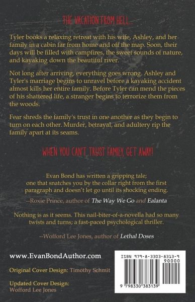 A relaxing retreat far from home and off the map was all they were looking for. Campfires, kayaking down the beautiful river, and the sweet sounds of nature. Ashley and her husband Tyler join her family on this gorgeous vacation. Not long after arriving, everything seems to go wrong. From a kayaking accident that almost gets the family killed to Ashley and Tyler's marriage unraveling. Before Tyler can mend the broken pieces of his shattered life, he notices a stranger watching them from the woods who quickly begins to terrorize them. Terror shreds the family's trust in one another as they begin to turn on each other. Murder, betrayal, and adultery rip the family at its seams. When you can't trust family, get away!
