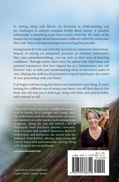 In Getting Along with Horses: An Evolution in Understanding, you will be challenged to reframe commonly held beliefs about the most effective ways to interact with your horse. A peaceful relationship is something many of us strive for. Yet, some of the lessons we're taught make it difficult to establish the connection we seek, and are based on techniques that are anything but peaceful. Seeing horses for who and what they are is key to cooperative and positive interactions. Instead of relying on antiquated practices or outdated information, you will discover ways to educate yourself and shift your understanding to the horse's point of view. Horses are hardwired to get along. In this book, you will find ideas that will help you to also get along with them.