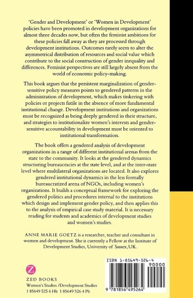Gender and Development or Women in Development policies have been promoted in development organizations for almost three decades now. Although they have helped improve the immediate material condition of women, by and large such policies have involved organizations in reproducing the ideological and material conditions for women's subordination in the family and the economy. This book offers a gendered analysis of development organizations in a range of different institutional arenas. It builds a conceptual framework for exploring the politics and procedures internal to the institutions which design and implement policy, and then applies this to the analysis of empirical case study material. Other contributions reflect on strategies to help organizations internalise or institutionalise gender equity; to make accountability to women a routine part of development practice.