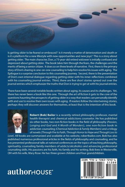 Is getting older to be feared or embraced? Is it merely a matter of deterioration and death or is it a platform for a new lifestyle with new opportunities and new joys? This is a story about getting older. The main character, Don, a 73-year-old retired widower is initially confused and depressed about getting older. The book takes him through the fears, the challenges and the merits of being a senior citizen. It does so on three levels of narrative. First, there is the primary story of Don's sharing in one-on-one counseling to help him resolve his issues with aging. The Epilogue is a surprise conclusion to this counseling journey. Second, there is the presentation of Don's own internal dialogue regarding getting older with his inner reflections combined with his counseling journal entries. Third, there are five short stories spread out over the journal entries which emphasize the truths that Don is trying to get at with his journal entries. There have been several notable books written about aging, its causes and its challenges. Yet, there has never been a book like this one. Through the art of fiction it gets to the core of the questions haunting the prospects of getting older in a way that readers can personally identify with and use to resolve their own issues with aging. If readers follow the intertwining stories, perhaps they will discover answers for themselves, at least that is the intention of this book.