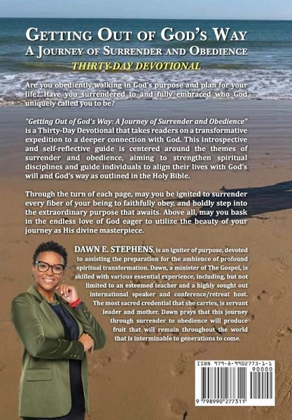 Are you walking in God's purpose and plan for your life? Have you embraced who God uniquely called you to be? "Getting Out of God's Way: A Journey of Surrender and Obedience" is a Thirty-Day Devotional that takes readers on a transformative expedition toward a deeper connection with God. This introspective and self-reflective guide is centered around the themes of surrender and obedience, aiming to strengthen spiritual disciplines and guide individuals to align their lives with God's will and God's way as outlined in the Holy Bible. Through the pages may you be ignited to surrender every fiber of your being, to faithfully obey, and boldly step into the extraordinary purpose that awaits. Above all, may you bask in the endless love of a God eager to utilize the beauty of your journey as His divine masterpiece.