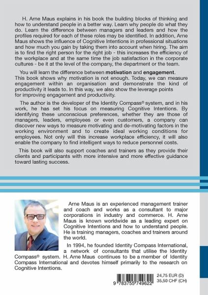 H. Arne Maus explains in his book the building blocks of thinking and how to understand people in a better way. Learn why people do what they do. Learn the difference between managers and leaders and how the profiles required for each of these roles may be identified. In addition, Arne Maus shows the influence of Cognitive Intentions in professional situations and how much you gain by taking them into account when hiring. The aim is to find the right person for the right job - this increases the efficiency of the workplace and at the same time the job satisfaction in the corporate cultures - be it at the level of the company, the department or the team.You will learn the difference between motivation and engagement. This book shows why motivation is not enough. Today, we can measure engagement within an organisation and demonstrate the kind of productivity it leads to. In this way, we also show the leverage points for improving engagement and productivity. The author is the developer of the Identity Compass® system, and in his work, he has set his focus on measuring Cognitive Intentions. By identifying these unconscious preferences, whether they are those of managers, leaders, employees or even customers, a company can discover new ways to measure motivating and demotivating factors in the working environment and to create ideal working conditions for employees. Not only will this increase workplace efficiency, it will also enable the company to find intelligent ways to reduce personnel costs.This book will also support coaches and trainers as they provide their clients and participants with more intensive and more effective guidance toward lasting success.
