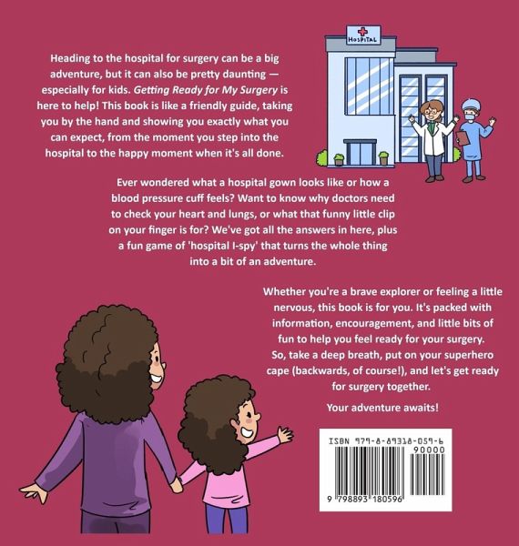 Heading to the hospital for surgery can be pretty daunting - especially for kids. Written by a board-certified anesthesiologist, Getting Ready for My Surgery is here to help reduce anxiety through a better understanding of the surgical process! This 40-page interactive book is like a friendly guide, taking you by the hand and showing you exactly what you can expect, from the moment you step into the hospital to the happy moment when it's all done. Ever wondered what a hospital gown looks like or how a blood pressure cuff feels? Want to know why doctors need to check your heart and lungs, or what that funny little clip on your finger is for? We've got all the answers in here, plus a fun game of 'hospital I-spy' that turns the whole thing into a bit of an adventure. Whether you're a brave explorer or feeling a little nervous, this book is for you. It's packed with information, encouragement, and little bits of fun to help you feel ready for your surgery. So, take a deep breath, put on your superhero cape (backwards, of course!), and let's get ready for surgery together. Your adventure awaits! The mission of this book is to provide your child with the following: Learn about their surgical journey via easy-to-understand language Understand what happens during their surgical process Empower your little one with their newfound knowledge Encourage your child to participate in their own healthcare Reduce their anxiety and fear about their surgery Embrace their surgical journey with more comfort, positivity, and confidence Get your copy today!!