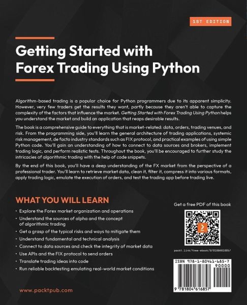 Discover the inner workings of today's forex market, the essential risks in forex algo trading, and how to mitigate them Key Features:Build trading applications with research and without advanced Python programming skills Dive into professional fx trading while enhancing your trading apps to be more accurate Develop simple yet efficient backtesting applications to help keep your expectations realistic Book Description: Algorithm-based trading is a popular choice for Python programmers due to its apparent simplicity. However, very few traders get the results they want, partly because they aren't able to capture the complexity of the factors that influence the market. Getting Started with Forex Trading Using Python helps you understand the market and build an application that reaps desirable results. The book is a comprehensive guide to everything that is market-related: data, orders, trading venues, and risk. From the programming side, you'll learn the general architecture of trading applications, systemic risk management, de-facto industry standards such as FIX protocol, and practical examples of using simple Python codes. You'll gain an understanding of how to connect to data sources and brokers, implement trading logic, and perform realistic tests. Throughout the book, you'll be encouraged to further study the intricacies of algo trading with the help of code snippets. By the end of this book, you'll have a deep understanding of the fx market from the perspective of a professional trader. You'll learn to retrieve market data, clean it, filter it, compress it into various formats, apply trading logic, emulate the execution of orders, and test the trading app before trading live. What You Will Learn:Explore the forex market organization and operations Understand the sources of alpha and the concept of algo trading Get a grasp on typical risks and ways to mitigate them Understand fundamental and technical analysis Connect to data sources and check the integrity of market data Use API and FIX protocol to send orders Translate trading ideas into code Run reliable backtesting emulating real-world market conditions Who this book is for: This book is for financial traders and python developers who are interested in forex trading. Academic researchers looking to focus on practical applications will find this book useful. This book can also help established fx market professionals who want to take the first steps in algo trading. Familiarity with Python and object-oriented programming within the scope of an online course or self-study is a must. Knowledge of network protocols and interfaces is a plus but not a prerequisite, as is specific knowledge about markets and trading.