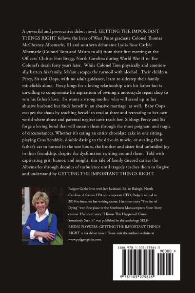 A powerful and provocative debut novel, GETTING THE IMPORTANT THINGS RIGHT is the family saga of Colonel Thomas McChesney Albemarle, his southern debutante wife, Ma'am, and their three children, Percy, Sis, and Oops. While Ma'am turns to alcohol to escape The Colonel's abuse, the children side-step the family mine fields alone and forge a loving bond that will sustain them through the chaos. Percy dreams of a loving relationship with his father, while Sis longs for a strong mother who will stand up to her abusive husband. Baby Oops retreats to a world of books where family conflict and parental neglect can't reach her. Told with captivating grit, humor, and insight, this tale of family discord carries the Albemarles through decades of turbulence until tragedy teaches them to forgive and understand by GETTING THE IMPORTANT THINGS RIGHT.