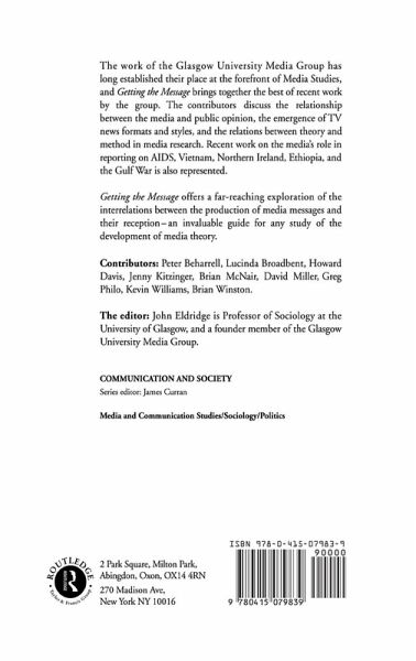 The work of the Glasgow University Media Group has long established their place at the forefront of Media Studies, and Getting the Message provides an ideal introduction to recent work by the group. Contributors discuss themes such as the relationship between the media and public opinion, the emergence of TV news formats and styles, and the relations between theory and method in media research. Recent work undertaken by the group on the media's role in reporting on AIDS, Vietnam, Northern Ireland, Ethiopia, and the Gulf War is also represented. In its fresh approach to the relationship between journalists and their sources and occupation analysis, the collection also illuminates how the earlier work of the group has been extended, and the ways in which its research has developed both individually and collectively. Getting the Message offers an invaluable and far-reaching exploration of the inter-relations between the production of media messages and their reception - an invaluable guide for any study of the development of media theory. John Eldridge is Professor of Sociology at the University of Glasgow and a founder member of the Glasgow University Media Group.