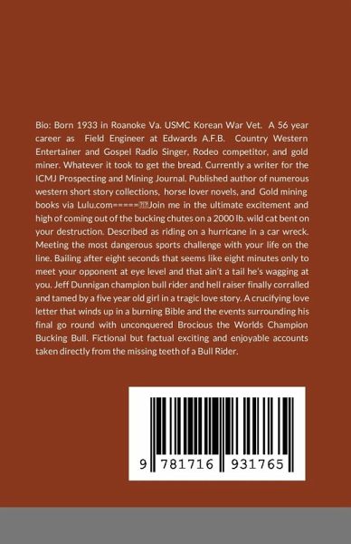 Join me in the ultimate excitement and high of coming out of the bucking chutes on a 2000 lb. wild cat bent on your destruction. Described as riding on a hurricane in a car wreck. Meeting the most dangerous sports challenge with your life on the line. Bailing after eight seconds that seems like eight minutes only to meet your opponent at eye level and that ain't a tail he's wagging at you. Jeff Dunnigan champion bull rider and hell raiser finally corralled and tamed by a five year old girl in a tragic love story. A crucifying love letter that winds up in a burning Bible and the events surrounding his final go round with unconquered Brocious the Worlds Champion Bucking Bull. Fictional but factual exciting and enjoyable accounts taken from the missing teeth of a Bull Rider.