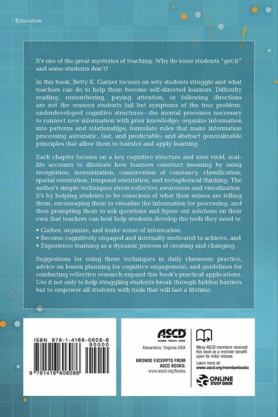 It's one of the great mysteries of teaching: Why do some students get it and some students don't? In this book, Betty K. Garner focuses on why students struggle and what teachers can do to help them become self-directed learners. Difficulty reading, remembering, paying attention, or following directions are not the reasons students fail but symptoms of the true problem: underdeveloped cognitive structures--the mental processes necessary to connect new information with prior knowledge; organize information into patterns and relationships; formulate rules that make information processing automatic, fast, and predictable; and abstract generalizable principles that allow them to transfer and apply learning. Each chapter focuses on a key cognitive structure and uses real-life accounts to illustrate how learners construct meaning by using recognition, memorization, conservation of constancy, classification, spatial orientation, temporal orientation, and metaphorical thinking. The author's simple techniques stress reflective awareness and visualization. It's by helping students to be conscious of what their senses are telling them, encouraging them to visualize the information for processing, and then prompting them to ask questions and figure out solutions on their own that teachers can best help students develop the tools they need to * Gather, organize, and make sense of information, * Become cognitively engaged and internally motivated to achieve, and * Experience learning as a dynamic process of creating and changing. Suggestions for using these techniques in daily classroom practice, advice on lesson planning for cognitive engagement, and guidelines for conducting reflective research expand this book's practical applications. Use it not only to help struggling students break through hidden barriers but to empower all students with tools that will last a lifetime.