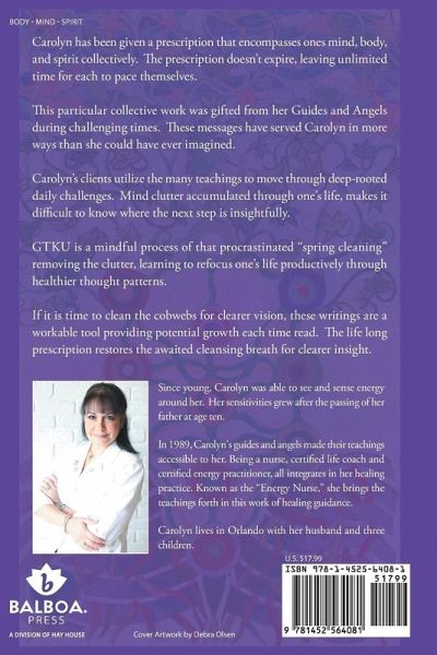 Carolyn has been given a prescription that encompasses ones mind, body, and spirit collectively. The prescription doesn’t expire, leaving unlimited time for each to pace themselves. This particular collective work was gifted from her Guides and Angels during challenging times. These messages have served Carolyn in more ways than she could have ever imagined. Carolyn’s clients utilize the many teachings to move through deep-rooted daily challenges. Mind clutter accumulated through one’s life, makes it difficult to know where the next step is insightfully. GTKU is a mindful process of that procrastinated "spring cleaning" removing the clutter, learning to refocus one’s life productively through healthier thought patterns. If it is time to clean the cobwebs for clearer vision, these writings are a workable tool providing potential growth each time read. The life long prescription restores the awaited cleansing breath for clearer insight.