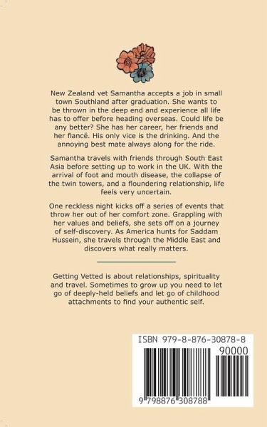 New Zealand vet Samantha accepts a job in small town Southland after graduation. She wants to be thrown in the deep end and experience all life has to offer before heading overseas. Could life be any better? She has her career, her friends and her fiancé. His only vice is the drinking. And the annoying best mate always along for the ride. Samantha travels with friends through South East Asia before setting up to work in the UK. With the arrival of foot and mouth disease, the collapse of the twin towers, and a floundering relationship, life feels very uncertain. One reckless night kicks off a series of events that throw her out of her comfort zone. Grappling with her values and beliefs, she sets off on a journey of self-discovery. As America hunts for Saddam Hussein, she travels through the Middle East and discovers what really matters. Getting Vetted is about relationships, spirituality and travel. Sometimes to grow up you need to let go of deeply-held beliefs and let go of childhood attachments to find your authentic self.