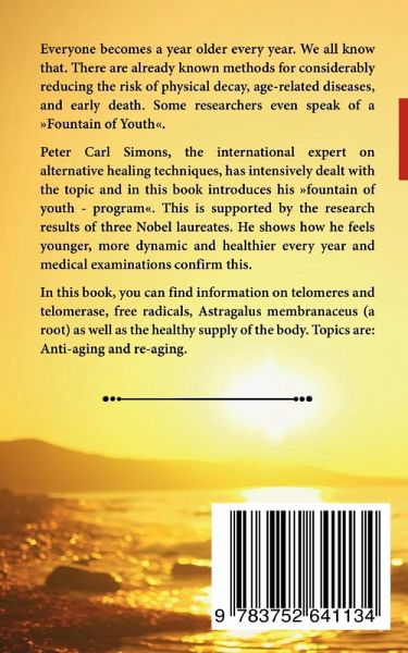 While stories of the proverbial 'Fountain of Youth' have followed mankind almost since our first waking moments, the concept really took hold in literature and imagination when Spanish Explorer Juan Ponce de Léon sought to find the fabled fountain in the 16th century. While he failed in his quest, modern scientists uncovered a pivotal clue to this ancient mystery in 2009 - a clue that has led to an amazing discovery that you can incorporate into your own life, today, to find your very own Fountain of youth - and start getting younger even as you age.Join Author Peter Carl Simmons on a revolutionary journey as he explores our very DNA, the history of again - and how it can be stopped with The Fountain of youth Program. Backed by verifiable studies and littered with studies, this guide is a truth seekers dream, one that will lead you to a brighter - and younger - future.