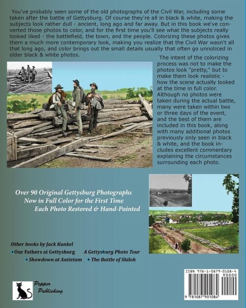 You've probably seen some of the old photographs of the Civil War, including some taken after the battle of Gettysburg. Of course they're all in black & white, making the subjects look rather dull - ancient, long ago and far away. But in this book we've converted those photos to color, and for the first time you'll see what the subjects really looked liked - the battlefield, the town, and the people. Colorizing these photos gives them a much more contemporary look, making you realize that the Civil War wasn't all that long ago, and color brings out the small details usually that often go unnoticed in older black & white photos. The intent of the colorizing process was not to make the photos look "pretty," but to make them look realistic - how the scene actually looked at the time in full color. Although no photos were taken during the actual battle, many were taken within two or three days of the event, and the best of them are included in this book, along with many additional photos previously only seen in black & white, and the book includes excellent commentary explaining the circumstances surrounding each photo. Most of the photos were taken by Matthew Brady and Alexander Gardner.