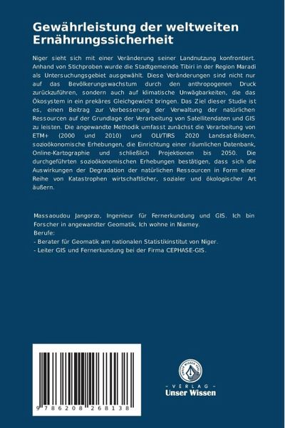 Niger sieht sich mit einer Veränderung seiner Landnutzung konfrontiert. Anhand von Stichproben wurde die Stadtgemeinde Tibiri in der Region Maradi als Untersuchungsgebiet ausgewählt. Diese Veränderungen sind nicht nur auf das Bevölkerungswachstum durch den anthropogenen Druck zurückzuführen, sondern auch auf klimatische Unwägbarkeiten, die das Ökosystem in ein prekäres Gleichgewicht bringen. Das Ziel dieser Studie ist es, einen Beitrag zur Verbesserung der Verwaltung der natürlichen Ressourcen auf der Grundlage der Verarbeitung von Satellitendaten und GIS zu leisten. Die angewandte Methodik umfasst zunächst die Verarbeitung von ETM+ (2000 und 2010) und OLI/TIRS 2020 Landsat-Bildern, sozioökonomische Erhebungen, die Einrichtung einer räumlichen Datenbank, Online-Kartographie und schließlich Projektionen bis 2050. Die durchgeführten sozioökonomischen Erhebungen bestätigen, dass sich die Auswirkungen der Degradation der natürlichen Ressourcen in Form einer Reihe von Katastrophen wirtschaftlicher, sozialer und ökologischer Art äußern.
