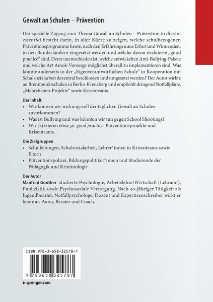 Der spezielle Zugang zum Thema Gewalt an Schulen - Prävention in diesem essential besteht darin, in aller Kürze zu zeigen, welche schulbezogenen Präventionsprogramme heute, nach den Erfahrungen aus Erfurt und Winnenden, in den Bundesländern eingesetzt werden und welche davon evaluierte "good practice" sind. Denn unentschieden ist, welche entwickelten Anti-Bullying-Pakete und welche Art Amok-Vorsorge möglichst überall zu implementieren sind. Was könnte anderseits in der "Eigenverantwortlichen Schule" in Kooperation mit Schulsozialarbeit dezentral beschlossen und umgesetzt werden? Der Autor wirkte an Brennpunktschulen in Berlin-Kreuzberg und empfiehlt dringend Notfallpläne, "Mehrebenen-Projekte" sowie Krisenteams.