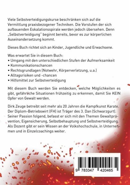 Viele Selbstverteidigungskurse beschränken sich auf die Vermittlung praxisbezogener Techniken. Die Vorstufen der sich aufbauenden Eskalationsspirale werden jedoch übersehen. Denn "Selbstverteidigung" beginnt bereits, bevor es zur körperlichen Auseinandersetzung kommt. Dieses Buch richtet sich an Kinder, Jugendliche und Erwachsene. Was erwartet Sie in diesem Buch: -Umgang mit den unterschiedlichen Stufen der Aufmerksamkeit -Kommunikationschancen -Rechtsgrundlagen (Notwehr, Körperverletzung, u.a.) -Alltagsrisiken und -chancen -Hilfsmittel zur Selbstverteidigung Mit diesem Buch werden Sie entdecken, welche Möglichkeiten es gibt, gefährliche Situationen frühzeitig zu erkennen, damit Sie KEIN Opfer von Gewalt werden.