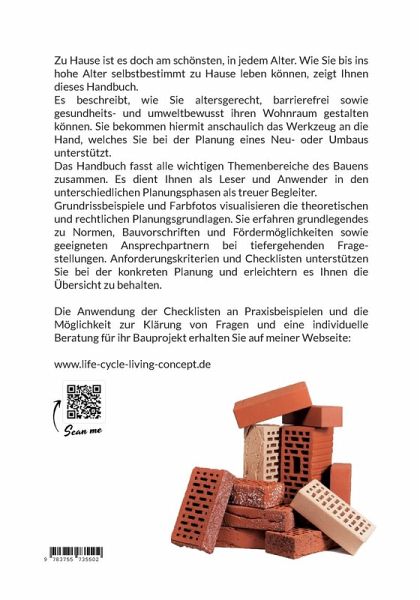 Zu Hause ist es doch am schönsten, in jedem Alter. Wie Sie bis ins hohe Alter selbstbestimmt zu Hause leben können, zeigt Ihnen dieses Handbuch. Es beschreibt, wie Sie altersgerecht, barrierefrei sowie gesundheits- und umweltbewusst ihren Wohnraum gestalten können. Sie bekommen hiermit anschaulich das Werkzeug an die Hand, welches Sie bei der Planung eines Neu- oder Umbaus unterstützt. Das Handbuch fasst alle wichtigen Themenbereiche des Bauens zusammen. Es dient Ihnen als Leser und Anwender in den unterschiedlichen Planungsphasen als treuer Begleiter.Grundrissbeispiele und Farbfotos visualisieren die theoretischen und rechtlichen Planungsgrundlagen. Sie erfahren grundlegendes zu Normen, Bauvorschriften und Fördermöglichkeiten sowie geeigneten Ansprechpartnern bei tiefergehenden Fragestellungen. Anforderungskriterien und Checklisten unterstützen Sie bei der konkreten Planung und erleichtern es Ihnen die Übersicht zu behalten.Inhalte:- Bestehende Wohnkonzepte für Senioren- Ressourcen- und energieeffizientes Bauen- Standortanalyse (u.a. Topographie, Klima, Infrastruktur)- Gestaltung des Grundrisses - Planung der Konstruktion- Wahl schadstoffarmer Baustoffe- Bedarfsgerechte Haustechnik- Geeignetes Lüftungskonzept- Lichtkonzeptgestaltung zur visuellen Unterstützung- Steigerung des Wohlbefindens durch geeignetes Farbkonzept- Förderung des Komforts und des Erhaltens der Selbstständigkeit durch entsprechende AusstattungDie Anwendung der Checklisten an Praxisbeispielen und die Möglichkeit zur Klärung von Fragen sowie eine individuelle Beratung für ihr Bauprojekt erhalten Sie auf meiner Webseite:www.life-cycle-living-concept.de